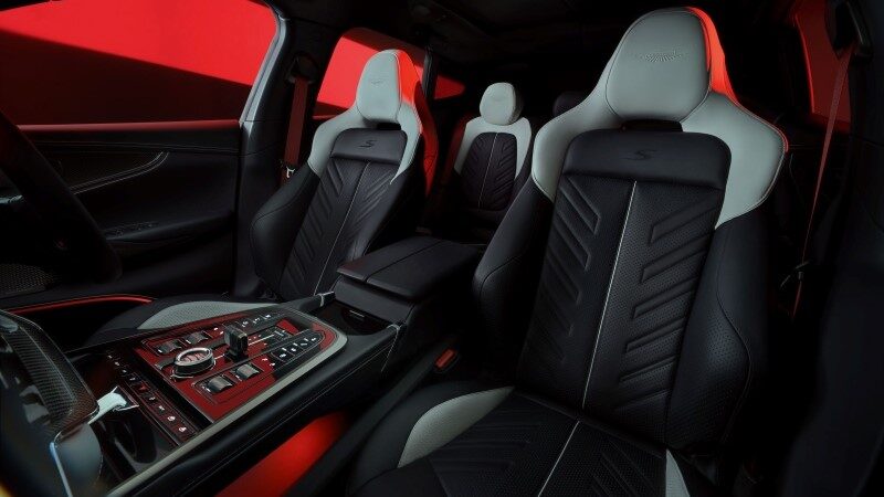 De série, o interior apresenta Alcantara esportiva e leve, utilizada nos bancos, forro do teto, console central, painéis inferiores do painel e acabamento superior. Em áreas de maior desgaste, como os apoios dos bancos, a Alcantara é harmoniosamente combinada com couro semianilina. Para quem busca ainda mais requinte, o interior pode ser totalmente revestido em couro semianilina. Cintos de segurança vermelhos são opcionais, reforçando a identidade “S”.