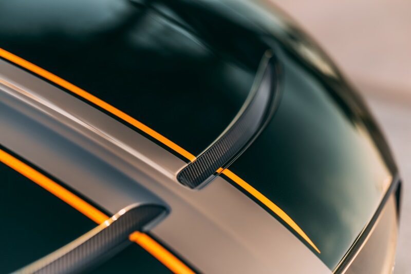 No coração desse exterior ousado está a Faixa de Corrida Batur, finalizada em Porpoise Brilhante e ladeada por faixas externas em Mandarin Brilhante, ambas combinando com o couro do interior, criando uma conexão visual perfeita entre o exterior e a cabine.