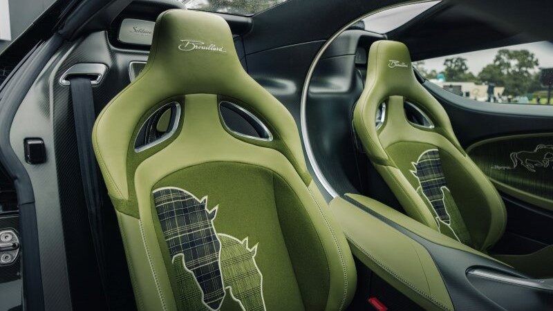 Um destaque especial é o seletor de marchas, que apresenta uma escultura artesanal do cavalo Brouillard. O carbono com tons esverdeados, detalhes em alumínio polido e um teto de vidro cristalino criam uma atmosfera de grandeza, remetendo à imponência de uma catedral. Este nível de customização de hipercarros reflete a dedicação da Bugatti à excelência artesanal.