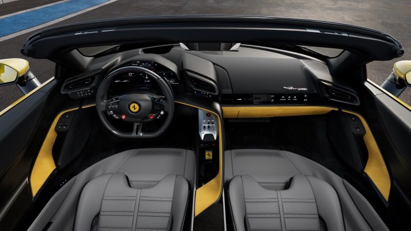 O interior combina uma berlinetta com a sensação de monoposto. O painel flutuante integra tela de 14 polegadas com Apple CarPlay, Android Auto e MyFerrari Connect. Bancos em couro ou fibra de carbono (Assetto Fiorano) oferecem conforto e suporte.